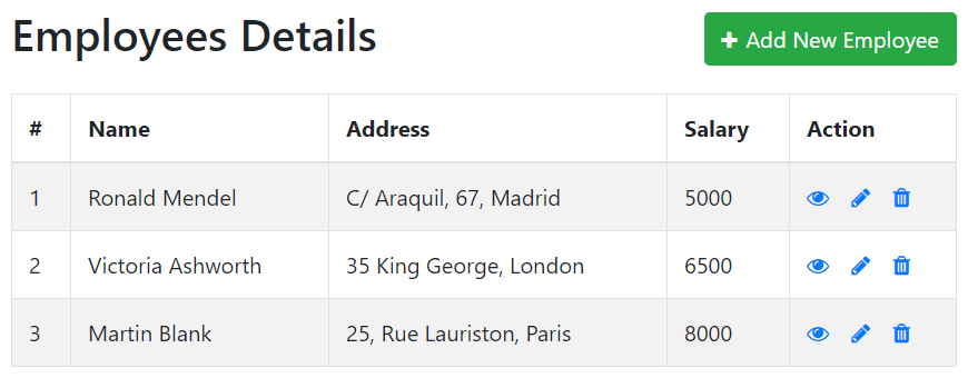 Once employees table is populated with some records the landing page i.e. the CRUD data grid may look something like the picture shown below: